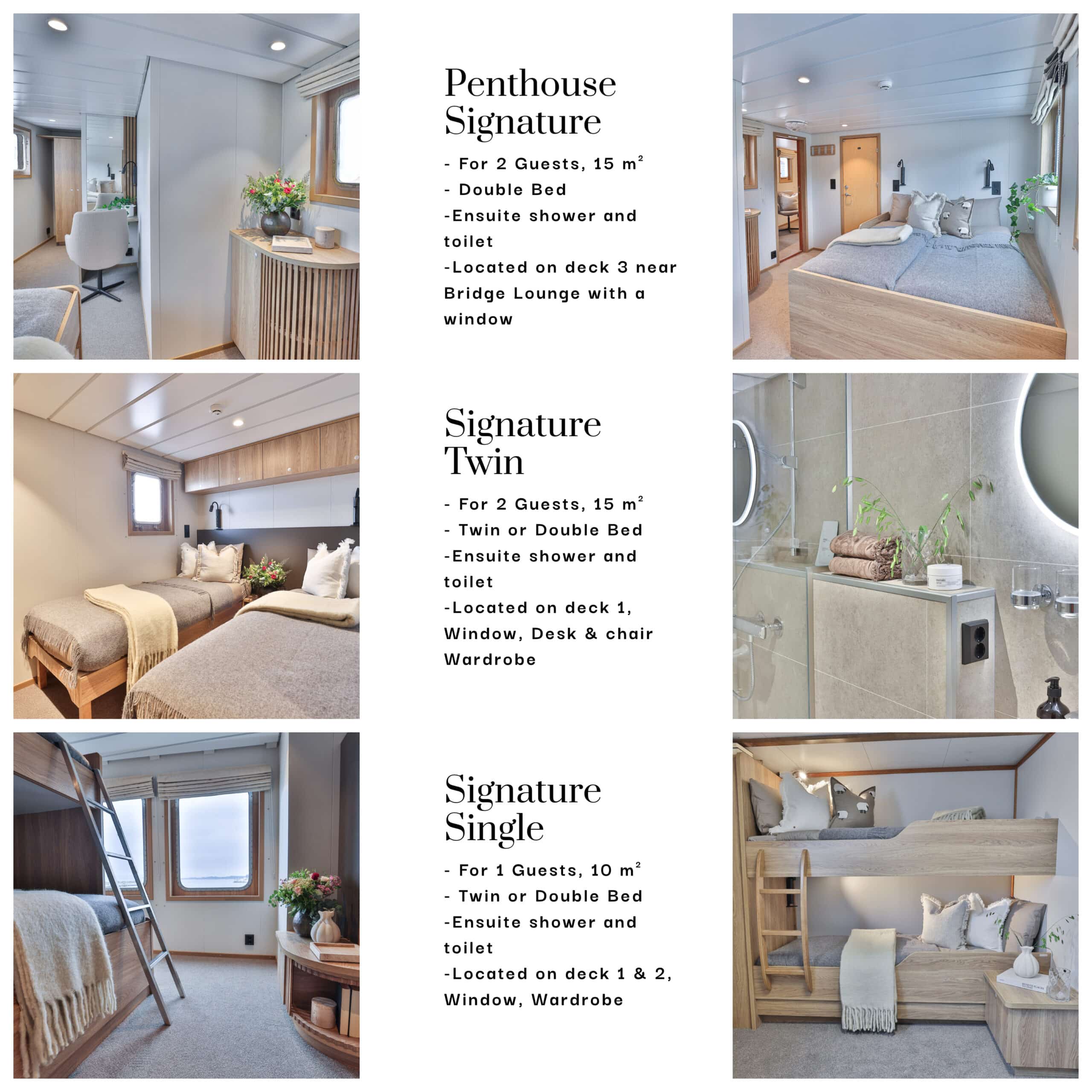 - Large en-suite cabins with suites, doubles, twins and singles with private shower and toilet.Â