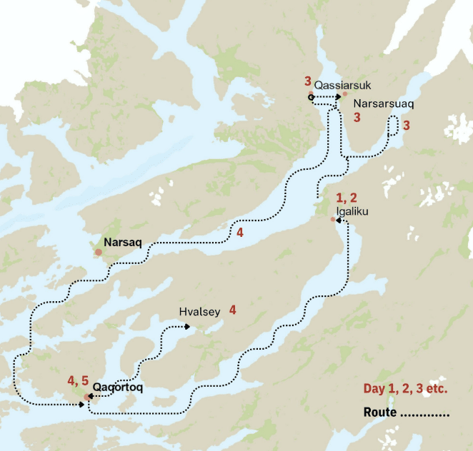During this 5 day trip, you’ll get to experience the charming southern part of Greenland. Once you’ve landed in Narsarsuaq you’ll be sailing to Qaqortoq (2 hours), amongst icebergs and possibly even whales and seals. The day after you’ve arrived in Qaqortoq you’ll get to see the first of the UNESCO sites, the church ruin in Hvalsey. Your exploration has just begun and over the next few days you’ll be out and discovering more Norse ruins in the prettiest landscapes, including a tour to the famous Qooroq Icefjord.